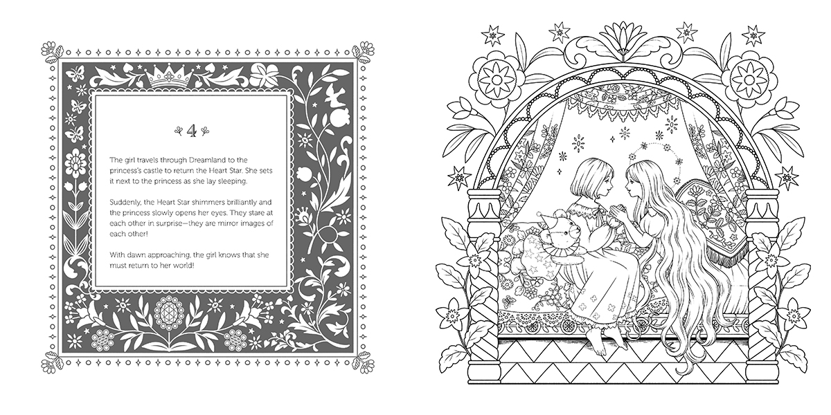In this enchanting fairy-tale colouring book, a little girl is fast asleep when a shooting star comes through her window and brings her beloved teddy bear to life. He takes her on a magical journey through Dreamland, where she meets the Astronomer and returns a star stolen from the sky to a princess. You’ll be transported as you colour the little girl as she journeys through Dreamland, the beautiful gardens of the flower ladies, the Astronomer’s observatory, and the princess in her castle, along with the animals who take care of her.