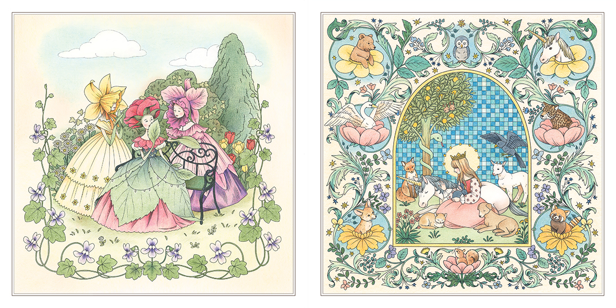 In addition to 59 pages of original black-and-white colouring designs filled with delightful details, there are four pages of artworks coloured by the artist to provide you with inspiration. And as a final bonus, there is a page of designs for you to colour in and cut out for use as message cards, printed on heavy stock.