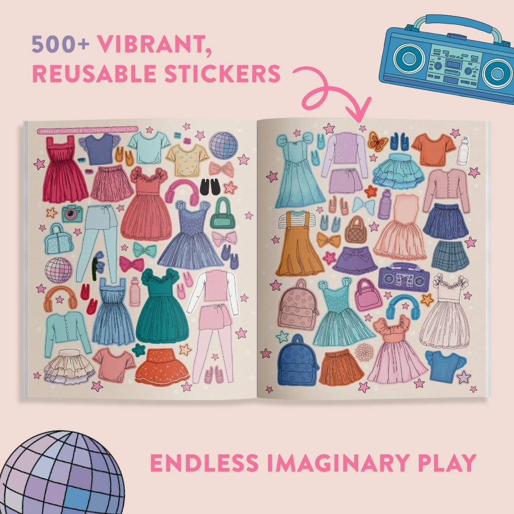 Packed with 500+ vibrant, reusable stickers created by bestselling artist Alli Koch (@allikdesign), this enchanting book includes a delightful array of clothing and accessories that can be mixed and matched across multiple characters, allowing for endless storytelling and imaginative play.